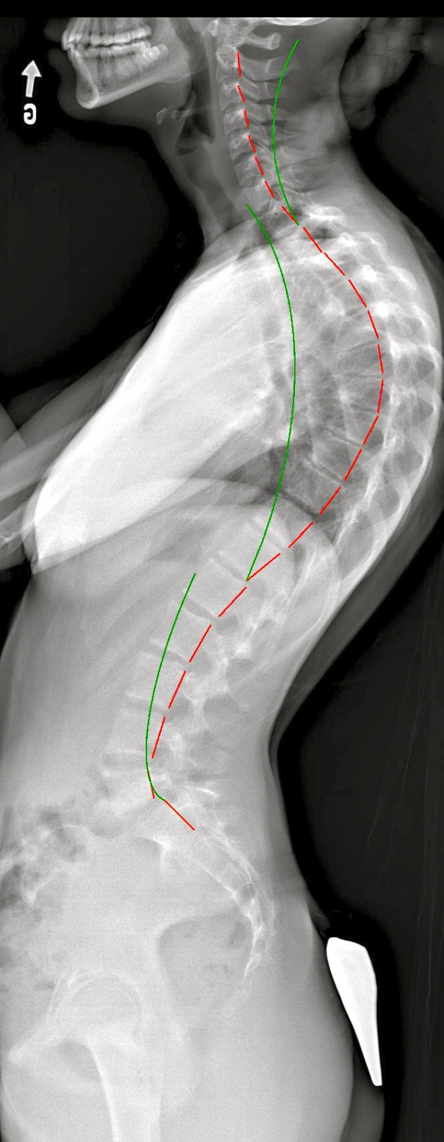 Profile X-rays of an adolescent patient with hyperkyphosis. The green line represents the ideal spinal curve and the red line follows the patient's spine. In the second X-ray, where the patient is wearing the SpineCor® brace, a significant reduction of the abnormal curve can be observed in the thoracic region, associated with a dramatic improvement of the lumbar curve.